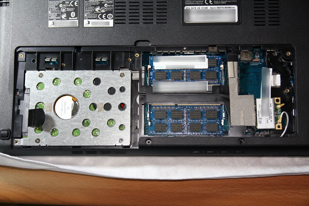 他的背板設計非常簡單,就一塊可以拆的,拆開來後就可以看到,我另外加的2G記憶體,所以裡面總共4G記憶體,而且我還特別要求兩條要同廠牌同顆粒的記憶體,我不想因為記憶體互衝來煩我,右邊是WIFI模組,左邊是硬碟的屁屁 ,黑色的一拉就下來了,拆裝非常方便,這也是我買這台的原因之一