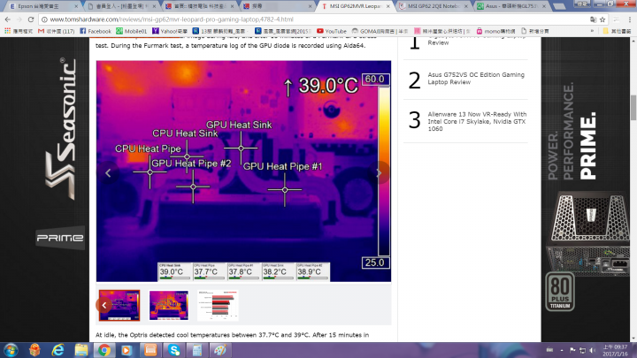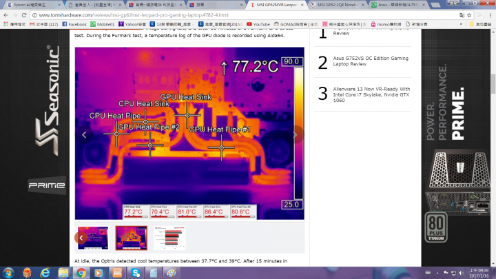 (以這個圖的測試結果來看, 華碩的 GL502VM 溫控看起來似乎比 MSI GP62MVR 還要好; 和某人一直強調微星的雙風扇加六導管比華碩好有一點事實上的差距, 雖然差距就算是最大值, GP62MVR 也不過就是高 6 度, 沒有那麼明顯)