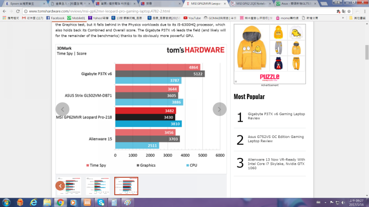 除了 Gigabyte P37X V6 是搭配 nVidia GeforceGTX 1070, 而外星人 15 用的是 Core i5-6300HQ 以外, MSI 用的是 nVme SSD 的比較表.