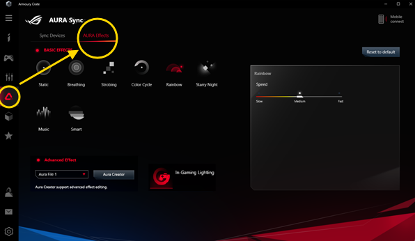 「AURA Sync」在「Armoury→AURA→AURA特效」內設定;