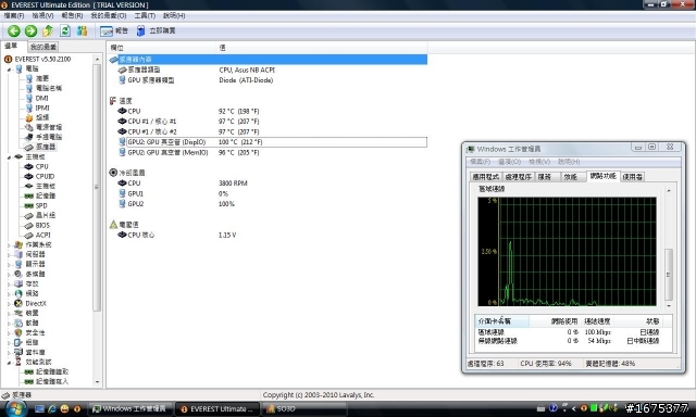 意義就是..............買東西要先做功課買到爛東西會痛不欲生感應器內容:感應器類型 CPU, Asus NB ACPIGPU 感應器類型 Diode (ATI-Diode)溫度:CPU 92 °C (198 °F)CPU #1 / 核心 #1 97 °C (207 °F)CPU #1 / 核心 #2 97 °C (207 °F)GPU2: GPU 真空管 (DispIO) 98 °C (208 °F)GPU2: GPU 真空管 (MemIO) 94 °C (201 °F)冷卻風扇:CPU 3800 RPMGPU1 0%GPU2 100%電壓值:CPU 核心 1.15 V