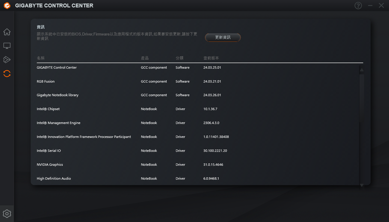您提到軟體更新是指GIGABYTE Control Center嗎? 還是? 若為GIGABYTE Control Center,查詢目前最新版本為24.03.29.01。建議您將目前安裝的版本至控制台>程式集>解除安裝移除,再至這裏下載/安裝重新測試。若仍有問題的話,煩請私訊提供以下資訊,以便為您做進一步確認: