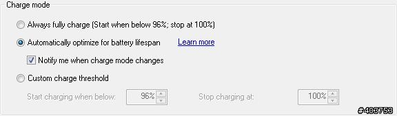 「若要變更電池充電模式,請在「電池資訊」標籤中按一下電池維護... 按鈕。「充電模式」選項下面列出三個選項。預設是選取自動最佳化電池有效期限。這個選項會監督電池使用情形以自動設定電池充電模式。起始模式是「最大執行時間」模式,這個選項會使用最大充電電壓來充電。當電池充電模式是設為「最大有效期限」模式時,可藉由降低充電容量來增加電池有效期限。若設為「最大有效期限」模式,工作列上顯示的「電源管理程式」電池量規會呈現綠色輪廓。一律完整充電(低於 96% 時開始;100% 時停止)使用「最大執行時間」模式。當電池的剩餘容量低於 96% 時,這個模式會開始充電,並在 100% 時停止充電。請注意,這個設定可能無法增加電池有效期限。您也可以建立自己的停止充電和開始充電臨界值,方法是選取自訂充電臨界值,然後輸入您偏好的值。」