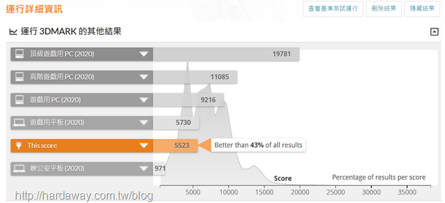 評測裝置顯示卡效能和CPU處理能力的3DMARK,以Time Spy模式測試3D效能得到5523分,大概領先43%進行測試的電腦系統。
