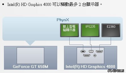 測試了一下應該是不行內建的 NVIDIA 獨立顯示晶片僅支援 Optimus 功能,運算結果仍需交由 Intel 內建顯示晶片輸出。而 Intel 內建顯示晶片規格限制,最多只支援 2 個螢幕同時輸出。小弟順道試看看GT系列的GTX460M猜測的不知道正不正確....