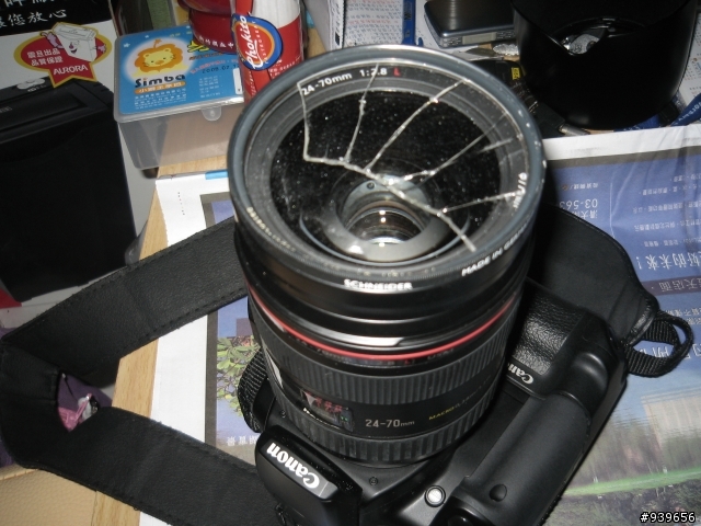 Hey~真巧,我是上週在河濱公園掛彩...一樣是保護鏡破裂,不過,鏡環卡死在24-105L上面,所以要送回日本去修(我是水貨)....隨著鏡片的破裂,我的心也跟著破裂了(1/2日至殞落那天,才剛買不到一個月~)附上絕無僅有的信乃達新型UV+特效濾鏡照片與實拍畫面.外觀實拍