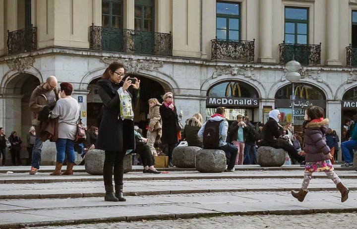 很棒的心得分享,街拍能顧到的東西真的不多,我的街拍重點比率:找到題材>選擇焦段>對焦準確>構圖>光圈快門值(曝光設定)>iso值拍到第一,沒拍到GG。另外樓主的一些技術上困擾其實都有辦法,最棒的就是裁切照片重新構圖。以下手癢以樓主的圖做一點後製,若不喜再跟我說以撤下。營造小朋友跑向媽媽的動感。凸顯白髮婦人的徬徨....有時黑白與正方構圖有意想不到的效果主體雖是左邊路人,但視覺卻是落在右後方女性身上,腳步沉重的歸途....開心的父女大膽裁切多餘的地板天空,視覺突然清爽全落在人們的一舉一動以上參考。