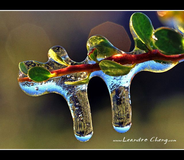 Mendoza山區度假屋庭院,清晨自動灑水系統工作後,灑在植物上的水因天冷而結冰: 銀鹽的感覺 - 微距篇
