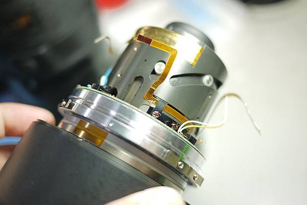 為了處理崩牙的螺絲,他打算卸除超音波馬達,在拉扯之間,他先把排線弄斷(圖四)(因為這款的設計很特別,不可以直接移除馬達,你必須先移除內鏡筒,這是很多人都不知道的!)