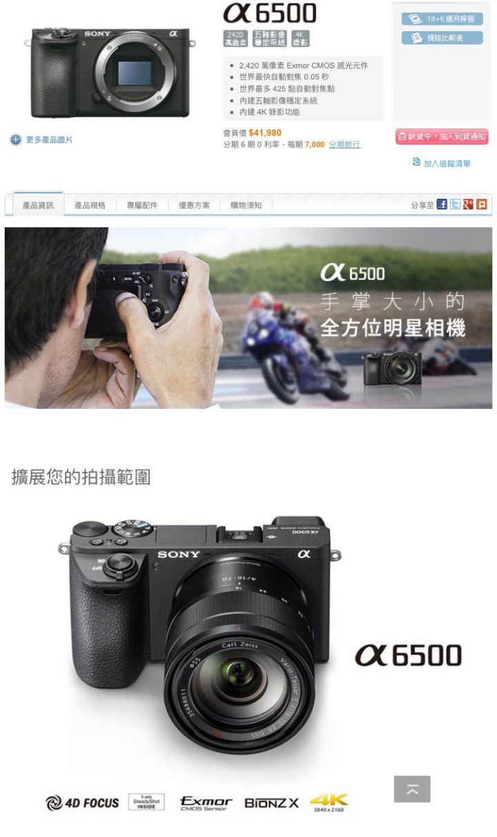 A6500 售價公佈 NT: 41,980跟其它國家售價比還算便宜跟其它旗艦機種比…便宜如果預購送電池其實還可以官網https://store.sony.com.tw/product/show/8a818bb957d60a880157db7805434ad0?currentCategoryId=CC8910531FA64534894CFC3A