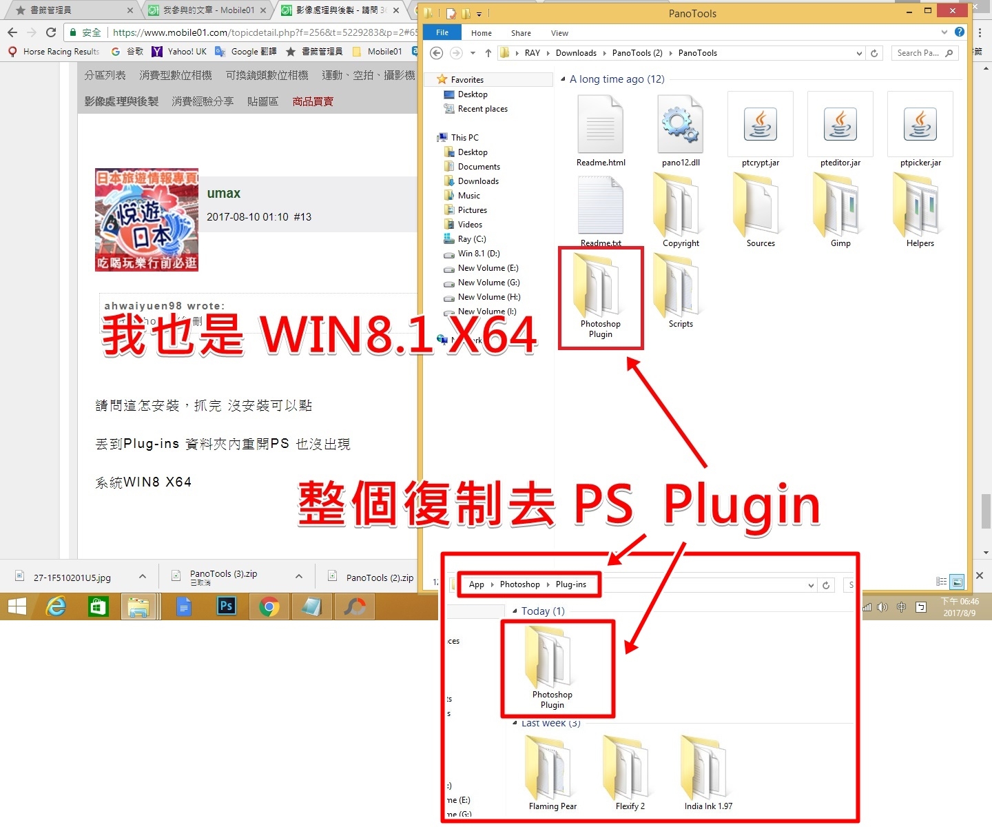 umax wrote:請問這怎安裝,抓完...(恕刪) 你是說上面的 PanoTools 2.6 全景工具??不須要安裝.解壓就看到 Photoshop Plugin 文件夾了.沒看到提及.我不知道 PS 有沒有分64及32. 我的PS是32位