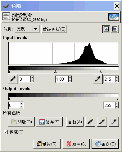 結果如下,畫面整體變明亮了(對比也提高了,因為色階被壓縮了,而且中灰值滑桿也會隨之移動)