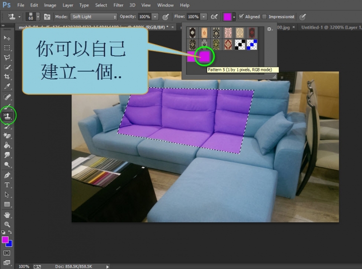 因為新買的沙發..還不知道要如何搭配裝潢的顏色..所以先拍照下來...但才發現..不知道要怎麼把要的顏色填滿到想要的區塊..先用鋼筆把局不選起來後.就不知怎麼做下一步了...請教一下各位是制作圖樣嗎?使用mac photoshop cc版