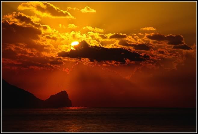 而日出的一剎那、散發的雲彩己經占滿畫面,而海岸邊的生動的人群,也跟著放大,更凸顯較果,