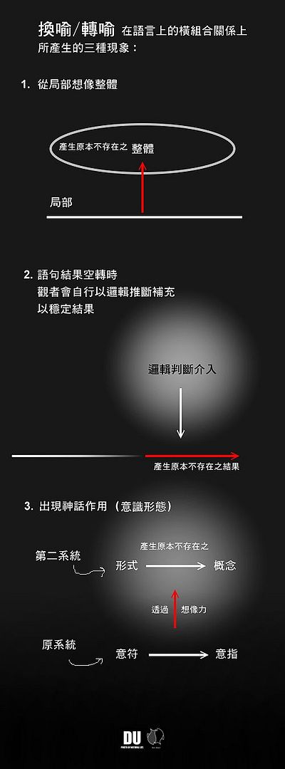 在換喻中,喻體其主體本身具有「相關性」,在語意軸上是一種橫向關係,而不是上述隱喻定義中的「類似性」。 我在與朋友研究換喻的「橫向關係」時,整理之後認為「換喻」(即轉喻)的定義總共會導致三種可能現象: