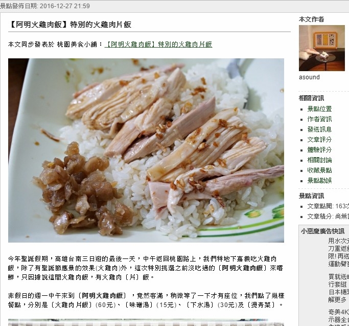 likedog wrote:文章在這邊 http...(恕刪) 號外!特優那張雞肉飯照片出自於01網友的文章喔~!身為01鄉民真是與有榮焉!【阿明火雞肉飯】特別的火雞肉片飯asound wrote: 2016『雞肉飯抵嘉』攝影比賽