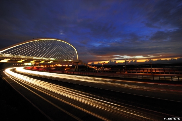 樓主的疑問應該在照片下半截,但是樓主觀察事物不是很有邏輯思考力,一條條光亮的弧度是與馬路的弧度平行,影像時間又在晚上,可想而知一定是路上車燈橫越畫面造成,要讓車子行進時圓圓一顆車燈成為一條亮線,當然就要快門長時間開啟,等待車子經過。這裡不教你怎麼照,而是教你怎麼看,怎麼想。