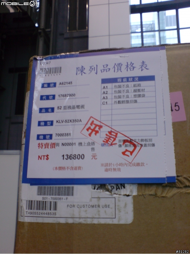 Novell wrote:小弟看的價格比較高....(恕刪) 我在搶52X的時候也是都剩下13萬多的11萬多的已經被買走了但是沒有看到10萬以下的52X我搬的是52X和46XW300和Z15根本就是新的詳見照片....