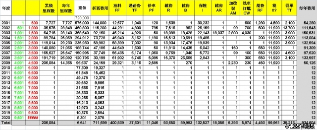 medicine1122 wrote:這個月剛交車..1....(恕刪) 版主及各位開柴/汽油車的先進, 有需此表格為愛車及尚在觀望購/換各型柴/汽油車的車友統計,當然也希望大家能養成紀錄的習慣, 忠實地呈現各種柴/汽油車輛之維修/使用成本, 以便未來想購/換車之普羅大眾能有參考, 若有意願者煩請將您的E-mail PM給在下, 在下將儘快寄送給您.小弟自從2001年8月買T牌A款1.8G型, 第一天加油發票到每次保養/稅/保險/規費收據等都以資料夾保存, 並利用公餘時間輸入EXCEL中(尚有02~06停車/過路費尚未輸入), 下個月即將滿八年, 目前總里程數已超過21萬公里, 原車除:1. 照後鏡防雨片2. 加裝前引擎室拉桿.3. 加裝ETC(已加裝LED照明燈)於室內照後鏡前.4. 改 小燈, 車側小方向燈(左紅右綠), 車室燈, 車門燈, 第三煞車燈, 後小燈, 煞車燈為LED.其餘未改裝, 未來可能要:1. 方向燈都改為LED及更換LED方向鏡燈.2. 加裝數位電視及GPS.3. 改原廠195/55/R16鋁圈.4. 加裝無線電車機(我有執照).截至上次加油為止, 油錢已花了NTD$400,839, 無奈近來車已漸顯老態且油價高漲, 故改天若有空可利用公式算算看-何時該汰換. 預計下一部車應為柴油車(二手手排考慮中), 希望到時大家的數據能給所有人參考, 將各種柴汽油車輛之維修/使用成本呈現, 以便大家購/換車時可以參考.也煩請別忘了: 若有更好的公式or公式錯誤, 也請勿忘通知我及分享給大家, 謝謝.