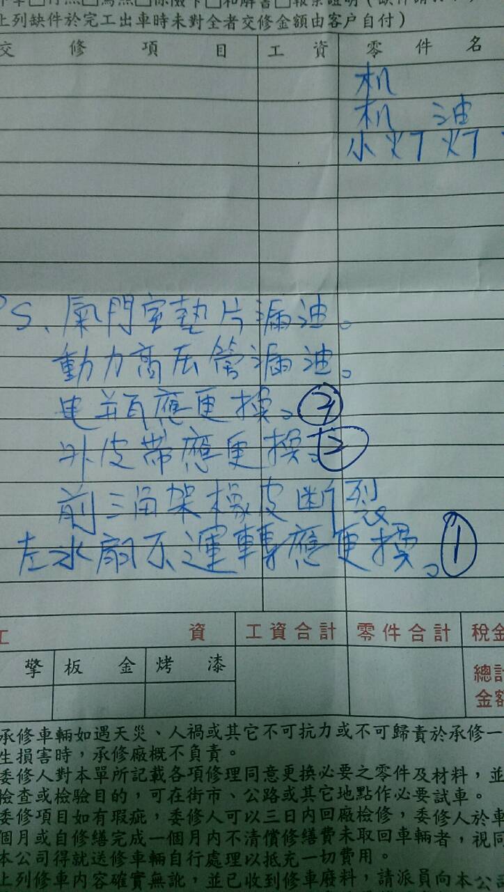 傻玥業 wrote:因為最近家人幫我找了...(恕刪) 機油400如果有含工錢那還OK。不然可以自備機油,200-300就有全世界各大廠的好油可以選,德國/法國/西班牙/意大利.... 以後自備就好了。下面那幾項有標1/2/3的應該是技師建議優先處理項目。至於動力高壓應該是指動力方向盤油,坊間有專門的動力方向盤止漏劑,可以先嘗試看看,不行再考慮維修更換。引擎上蓋滲油如果不嚴重可以晚點處理。