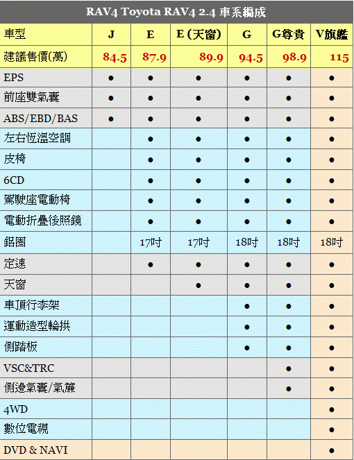 RAV4 G(2SRS) => G尊貴(6SRS+VSC)只差了4.4萬!?那.....我的CRV-SX可以加嗎!?再次強調6SRS的重要性,尤其是遇側撞時 : 側撞實錄(沒側氣囊/氣簾絕對毀容)再次強調ESP(VSC)的重要性,尤其對SUV來講 : ESP的作動原理/影片/相關連結PS:個人是安全取向,Accord/RAV4有6SRS+ESP才是王道!