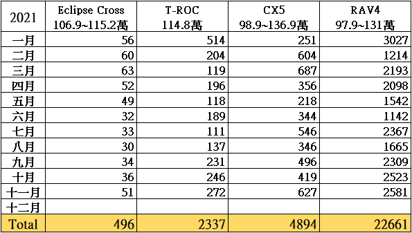 強者我鄰居 wrote:日蝕可能要等到大改款才比較有機會了,這代EC大概就這樣了,再幾天12月成績也將要揭曉,估計也不容易有所倍增 沒有賣不出去的產品,只有賣不出去的價格三菱日蝕Eclipse Cross目前訂價 106.9~115.2進口休旅,差不多價位對手Eclipse Cross : 106.9~115.2CX5 : 98.9~136.9RAV4 : 97.9~131T-ROC : 114.8