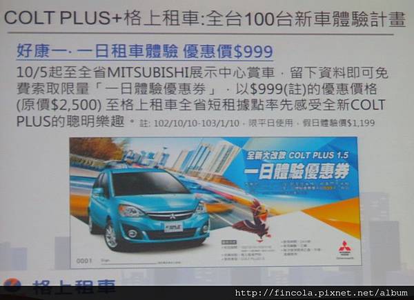 現在COLT PLUS與格上租車合作, 在全台提供100台新車, 讓車主可以用999元的優惠價一日體驗