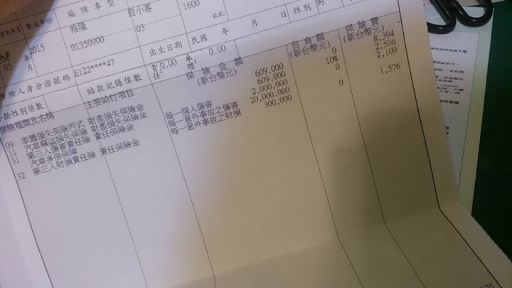 DDT大大可否幫我看看我的丙試保險總金額14675當初我也擔心保險被保高了可是看金額好像不高~因為保險的部分我就沒去研究也沒保幾樣本來偏向只保強制險的因為家人堅持新車要保險還覺得不夠想要改乙試被我擋下來我家人是滿介意車子停外面被破壞還是我是否該多保幾個甚麼保險我也覺得行家皮椅領牌車折7萬5還好而已(居然有人為此私訊說我唬爛@@~超級介意~不求最低價只求合理價)前面的文章我有說其他版本領牌車可以折到8萬5的應該跟大大的版本比較接近至於配件折價的部分我可能接近拿到對折吧因為我用網拍的價格來算都不只他報的31000這點我還滿開心的DDT1980 wrote:家裡之前買豪華版全...(恕刪)