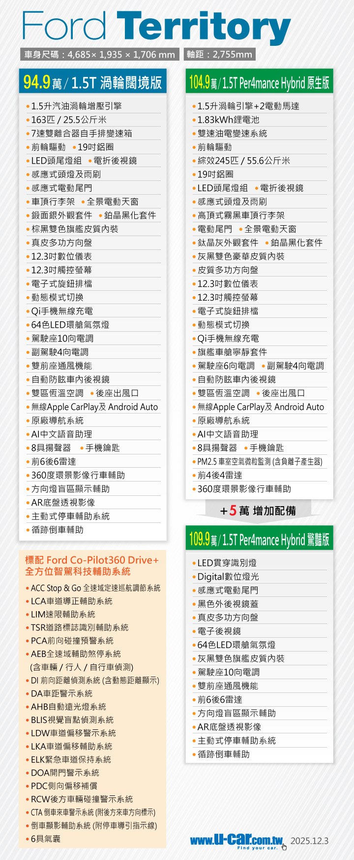 台北的好野人 wrote:這價格讓準備上市.跟未來要上市差不多價格的.乾脆鎖在雲端裡.賣了也是賣心酸的.2025-12-26 15:59 #94 其他公司不用賣,真的摸???郭董常說的名言:「魔鬼藏在細節裡!」(1)Territory 1.5T Hybrid & 1.5T油車,稅金每年約11,920元RAV4 2.5 Hybrid 每年稅金高達 22,410元22410 - 11920 = +10,490元以台灣中型SUV普通人使用年限十年計算:RAV4 2.5 Hybrid單單稅金就要多負擔,10490 * 10年 = 10萬4千900元(2)RAV4 2.5 Hybrid 要直上131萬旗艦款,才搭載天窗、感應式電動尾門及通風椅Territory只要95萬 1.5T 汽油闊境版,通通都有了131 - 95 = + 36萬(3)連最最普通的【雨滴感應式雨刷】,RAV4 2.5 Hybrid還要從台灣銀行存摺,掏出123萬買尊爵+款,才能享受Territory只要95萬 1.5T 汽油闊境版就有了123 - 95 = +28萬P.S.(4)(5)全景式天窗從寶獅408例子要5萬塊;選配通風椅從Picanto例子要2萬塊(下圖)(a)(b)根據隔鄰寶獅408的價目表(下圖)一個“全景式大天窗”就是如假包換台幣5萬塊唷