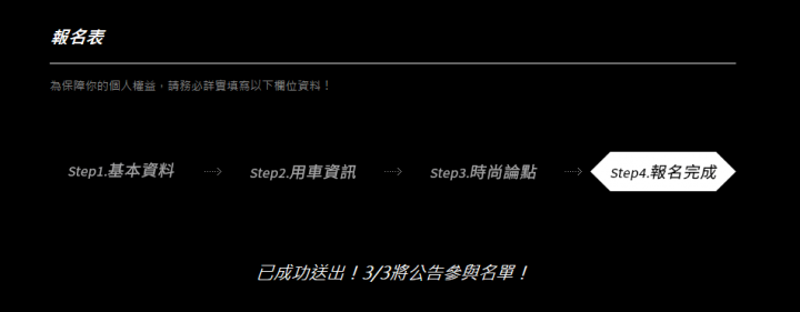 報名成功,希望有機會可以抽中搶先試駕的機會!!