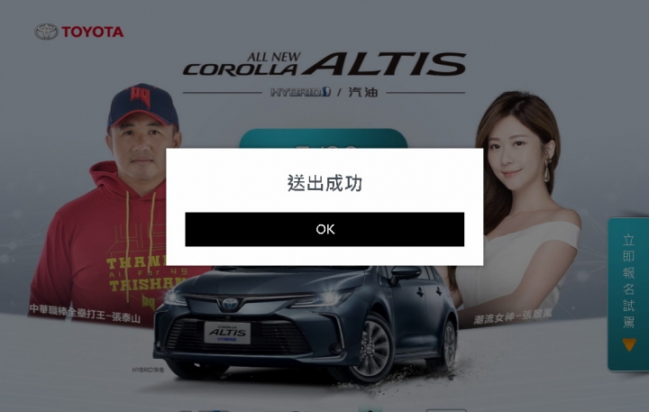 已完成下列三步驟:1. 進入官方報名連結:https://www.toyota.com.tw/event/altistestdrive/2. 將全新大改款TOYOTA ALTIS HYBRID官方試駕活動報名成功畫面截圖貼回此活動公告3. 進入01報名系統填寫個人資料(資料僅作為聯絡寄送用,請填寫真實正確資料)