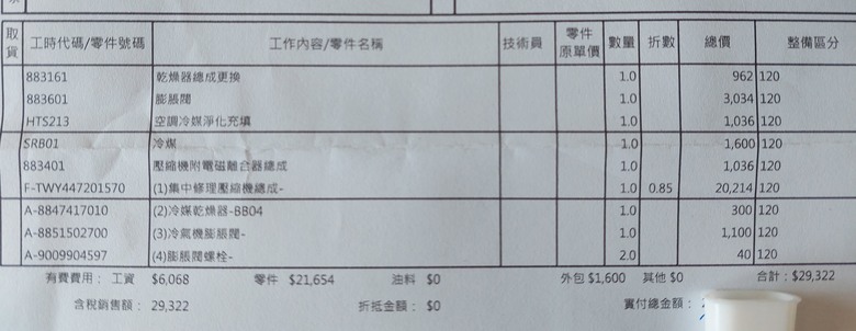 現在TOYOTA車子的通病大多多是冷氣壓縮機電磁閥故障冷氣會忽然不會製冷只要重新開關A/C鍵就會暫時回復正常時間久了不製冷的問題會越來越嚴重使用時間久了電磁閥內阻過高效率變差會使電磁閥開度不足低壓壓力會過高高壓壓力會低一點點始的冷氣製冷效率變差出風口一邊熱一邊涼換電磁閥就能夠回復正常運氣差一點的電磁閥斷在壓縮機裡面就要換整台壓縮機更換電磁閥需要冷氣冷媒還沒卸壓時拆卸壓力太低,電磁閥不容易退出來外廠單換電磁閥+重灌冷媒就要4000左右10.5代altis原廠換台製壓縮機約29000日製壓縮機約49000最近幾天的報價台製壓縮機價目單「內容包含壓縮機、膨脹閥還有乾燥包」
