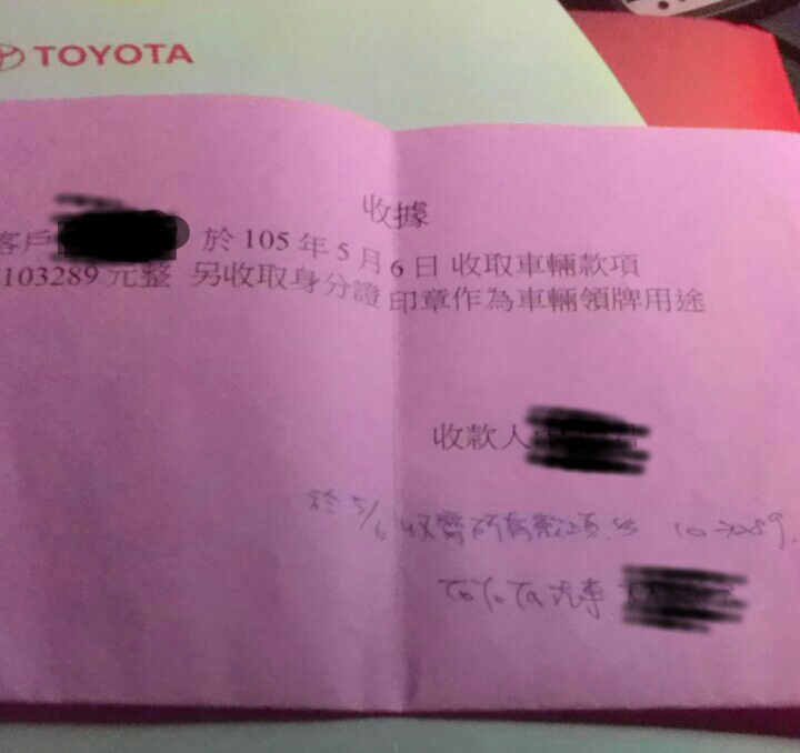小妹第一次買車,昨天付了頭款跟交出證件準備辦領牌,業務給我這張...我問怎沒有正式收據?她說公司沒有收據,這她自己Key的。說因公司不擔責任????我只能想到多請她簽名~~~雖然談車買訂的過程很愉快,她人也不錯,但付了辛苦錢跟交出重要證件缺只給了這張,心裡總不踏實...,請教大大們此法是否正常...?