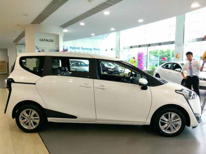白色的SIENTA就剛好從廠內開出來大門口準備展示