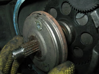 從傳動軸卸移出"壓力板" (圖片內, 黃手套中取持的那一片明顯的鏽斑)後, 就看得到啟動盤 (圓形)。