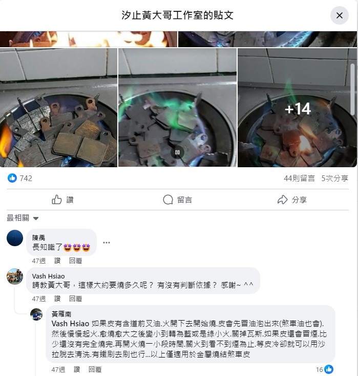 如果是金屬燒結的可以用火燒掉前叉油, 一般的不適用喔, 會直接脫落