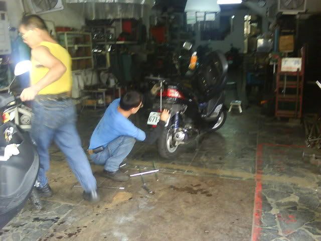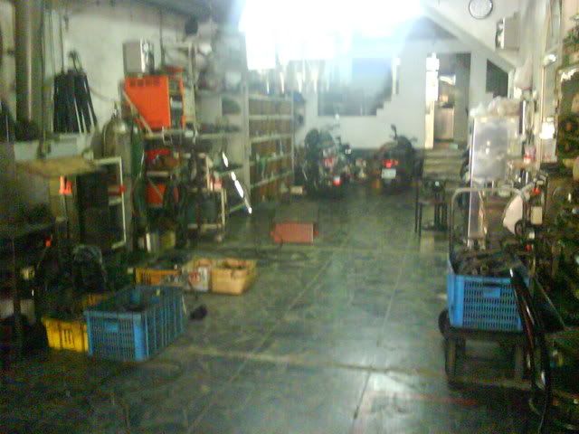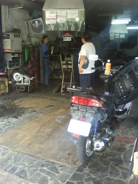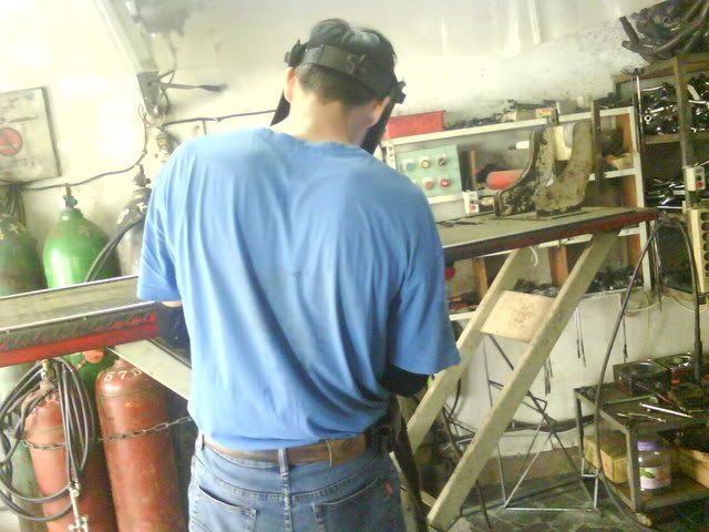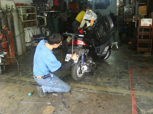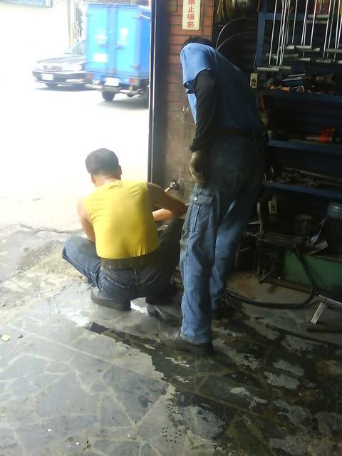 --------------------RV後製物架強化版--------------------------小的已經弄好了..推一下這店家...工夫好價格公道...在桃園有響叮噹的名號.....話不多說..先看照片吧....今天去的店家...專拉車台受損...老闆的紅屁屁...中途有客人來訪...這一張是師父幫機車店焊排氣螺絲的座...量量看....功夫真的不錯...快要完工了....烤漆中....勿擾...我也要烤焦了...真他.....有夠熱..辛苦的代價.....技術好嗎...試靠一下...阿娘威...有夠堅固的啦....現在是怕箱子會撐不住我的重量...:038