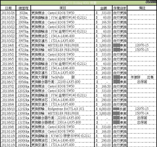 後輪胎里程(公里):13,000 後輪胎費用(元):3,400 煞車碟盤費用(元):還沒換