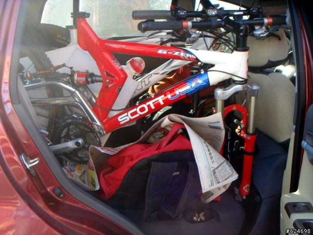 今天首次試將YUKON 塞進TOYOTA TERCEL 內, 因為懶得拆座管所以塞得很痛苦... 底下放厚點的報紙可放心不會磨破, 龍頭用伸縮帶綁好車子就不會亂動了, 兩個輪子就丟後車箱,依這個情況看, 塞兩部進去應該不是問題, 還可以再載一個人.