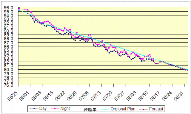 看到版大的文章讓小第深感佩服.小第也在7月初加入天天自行車減肥的運動.頗為巧合的是小弟在7月初體重剛好也跟版大同為95公斤.天天利用時間騎自行車一~二個小時.感覺身體狀況好時騎騎山路.狀況不好時騎平路.加上晚餐只吃燙青菜.近一個月來體重也減重到89公斤.個人希望減重到78公斤.在此希望與版主共勉之.繼續加油