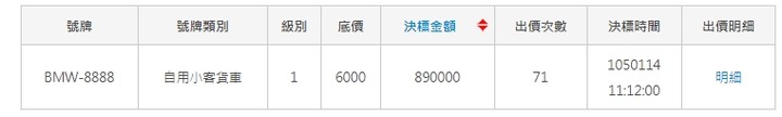 去年歡慶光輝10月,嘉義區監理所接連3天,舉辦代碼BAY的新式自用小型車號牌網路競標,號碼為BAY-0001至BAY-9999等共6560組號牌,其中最熱門的8888、6666等吉祥數字號牌,起標價為6000元,競標熱烈。