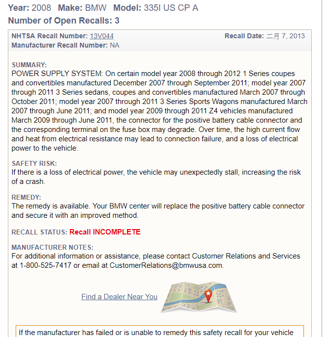 全球性的安全召回,無論美日規車,汎德都要處理(不處理直接寫信到德國原廠),去年我有回廠,召回美規 F10 535i vanos螺栓瑕疵更換,電話請直接打台北總公司0800客服,會請你fax行照給他們,若没在汎德保養過,會先請你進廠登錄資料,再插電腦掃故障碼,確認車子是否有其它問題,之後會叫料,等料到會再聯絡你進廠!