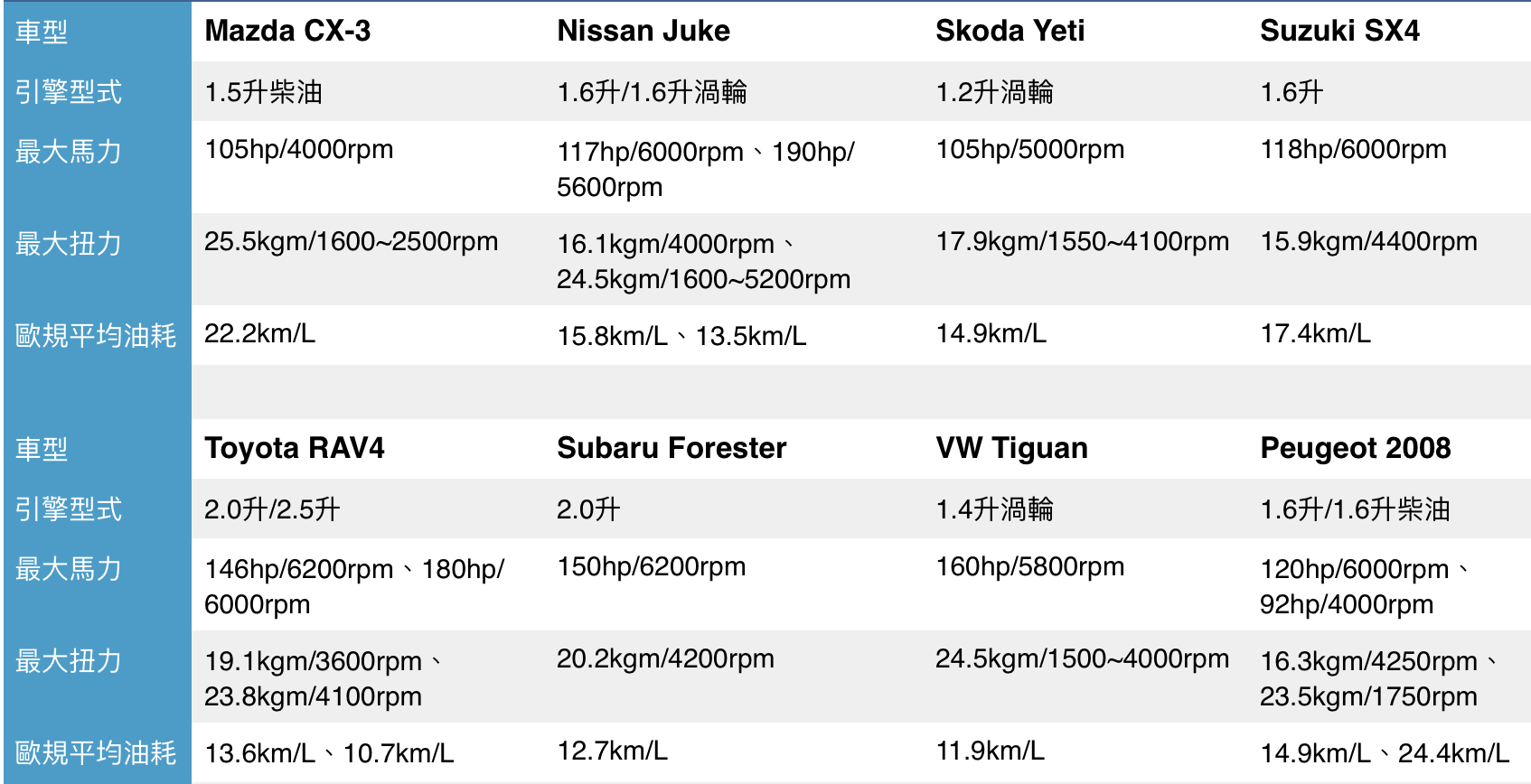 看01整理的資訊僅比較動力時, 除非你開車時候都要拉到4.5千轉以上不然上排除了JUKE TURBO, 其他幾乎都比不上這顆1.5柴引擎下排除了2008外, 其他車型應是與CX-5做比較才是而2008柴油版的數據就真的接近CX-3的1.5柴這顆引擎而2008柴最入門也要99.9萬, 我相信CX-3正式售價會比他低個.......1萬吧 XD