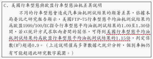 這兩種方式基本上測試內容就不相同,因此油耗數據自然有段差距,能源局也有提供換算方式: