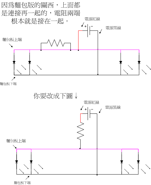 cgc wrote:1.把那個電阻拔起來...(恕刪) 看我畫的圖比較快…因為麵包版的關西,上面那條是"整個連接"再一起的…下面那條也是"整個"連再一起…那你把電阻放在上面那條,不就等於電阻的兩端接在一起?你目前接法是上圖,所以你畫的圖也不對…我寫的步驟是讓你變成下圖… 這樣就不會燒掉了~看圖吧~↓成功記得告訴我黑