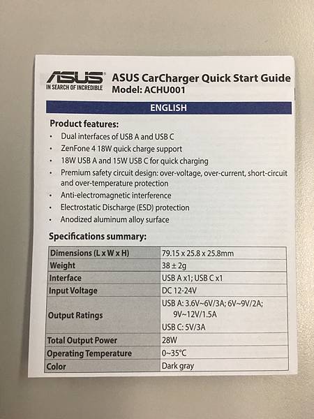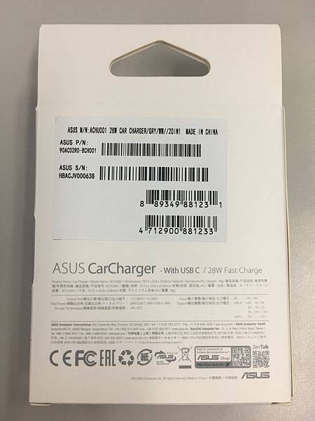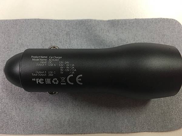 這顆車充的正式產品名稱是:Asus ACHU001 28W CAR Charger