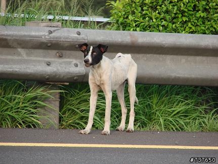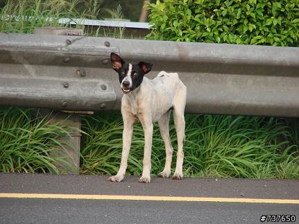 看見中隔島中有一隻瘦到皮包骨的白底黃斑狗