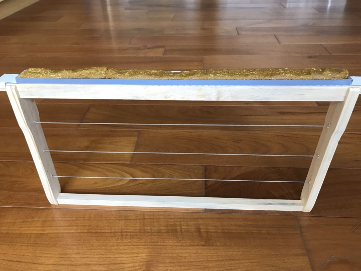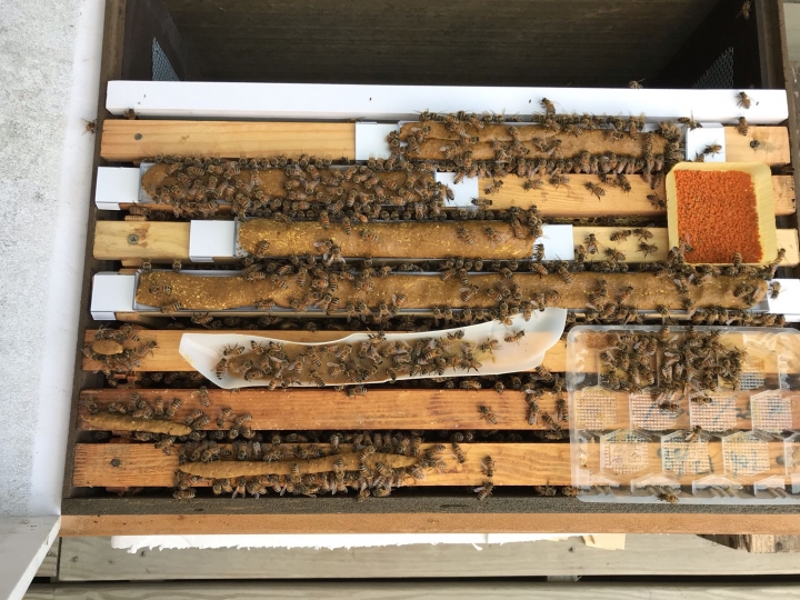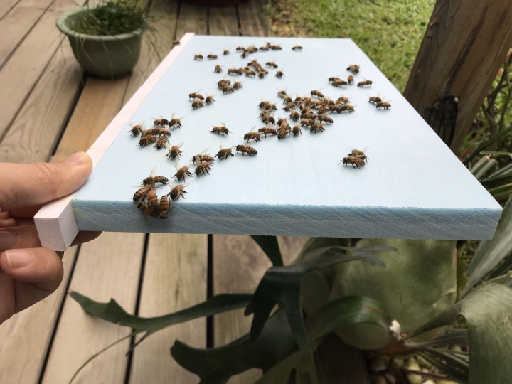 自製蜂糧盒以後巢框上面很乾淨了https://www.youtube.com/watch?v=th-Ipz20GdY蜂糧太稀, 會垂流到框,太大團, 小蜜吃得慢...蜂糧放巢筐, 時間久了, 框就黏又髒乾脆自治蜂糧盒在廚房將蜂糧填充好打開蜂鄉蓋後, 就可以將蜂糧直接套在巢筐上以後就不會搞得滿手滿筐材料:0.3mm厚度P E T先用切割成型接下來貼雙面膠開始按照切割線折出盒子再使用膠帶, 固定四邊擋牆.架在框上的狀況在廚房填充蜂糧準備上菜啦蜂糧備妥上桌了, 小蜜準備開飯啦(突然覺得小蜜好像豬隻一樣, 圍上來吞食)珍珍魷魚絲的盒子除了做糖水盒順便把小蜜蜂的糧食放下去,感覺也蠻好用的
