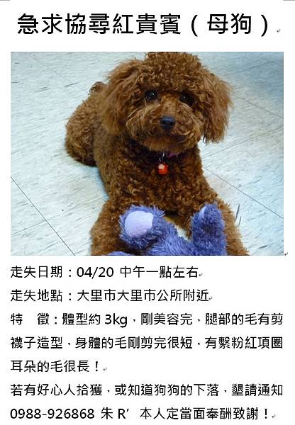 【急--協尋愛犬-紅貴賓】【台中-大里】我家的愛犬中午約1點鐘,走丟了!煩請住在大里市公所附近,或有經過大里路這邊的朋友們,幫小弟留意看看!若有尋獲,本人當面致酬感謝!拜託!拜託!走失地點:大里市大里市公所附近(4/20中午)犬種:紅貴賓 (母狗,體型約3kg大小)走失時的毛髮是:身體毛很短很短,四腳有剪襪子造型,有粉紅色項圈!這隻狗狗是中風兩次的家母的心肝寶貝!拜託大家!幫忙協尋一下!