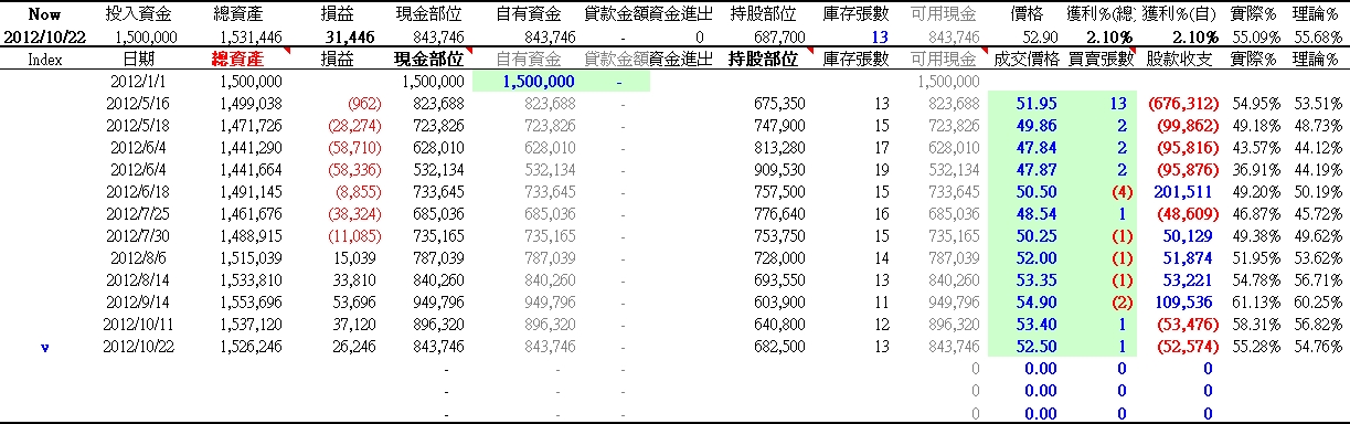 10/22於開盤時,以52.5元,買1張,如下表:買賣交易的計算是:1. 股價跌至52.5元,應保留現金比例54.76%。。2. 買進1張,使實際現金比例為55.28%。詳細請參考:http://0050-option.blogspot.tw/2012/10/0050-20121022.html歡迎加入台灣50(0050)平衡比例投資法:【社團@Facebook】、【論壇@Google】。